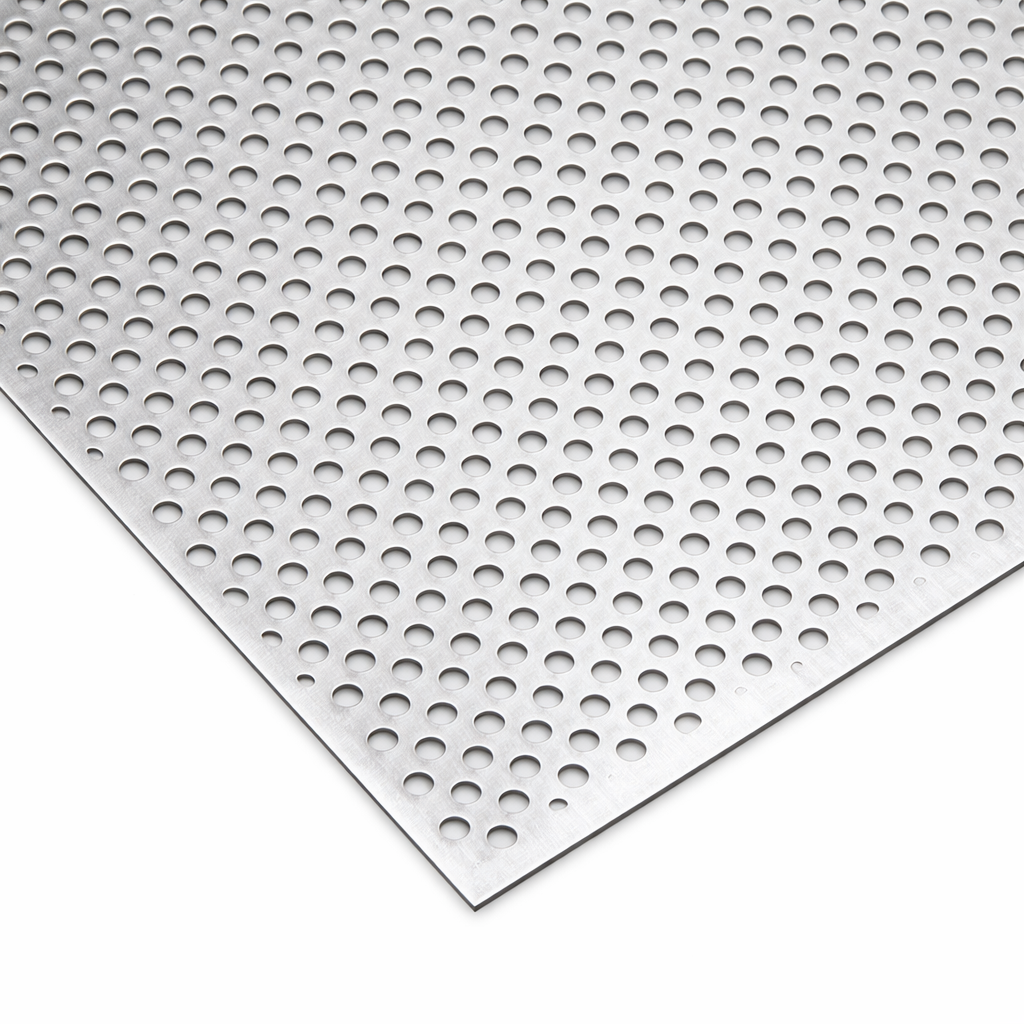Sus perforaciones regulares permiten el paso de aire, líquidos o luz, manteniendo al mismo tiempo la rigidez estructural del acero inoxidable.